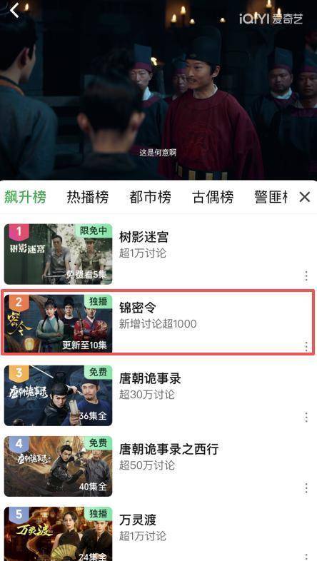 《锦密令》上线桃厂,开播就斩获站内飙升榜第二,热度直逼影帝廖凡主演的《树影迷宫》。